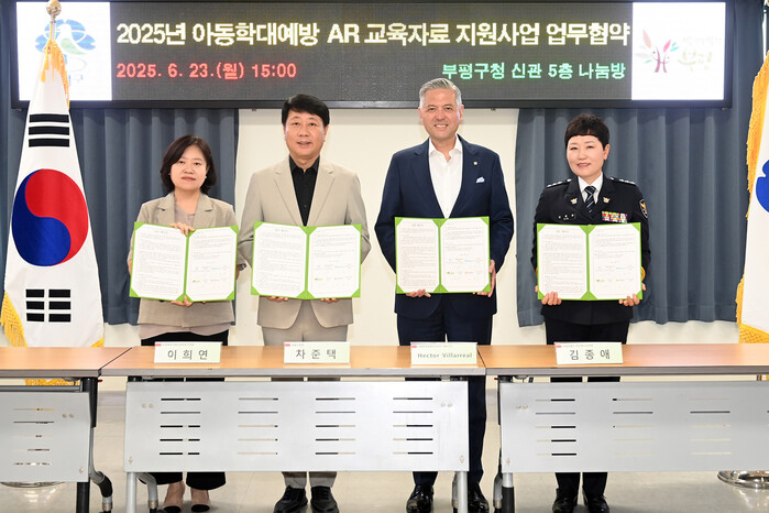 [인천=문찬식 기자] 인천 부평구(구청장 차준택)는 지난 23일 구청에서 ‘아동학대 예방 증강현실(AR) 교육자료 지원사업’ 추진을 위해 지엠한마음재단코리아, 인천북부아동보호전문기관, 부평경찰서와 4자 업무 협약을 체결했다.