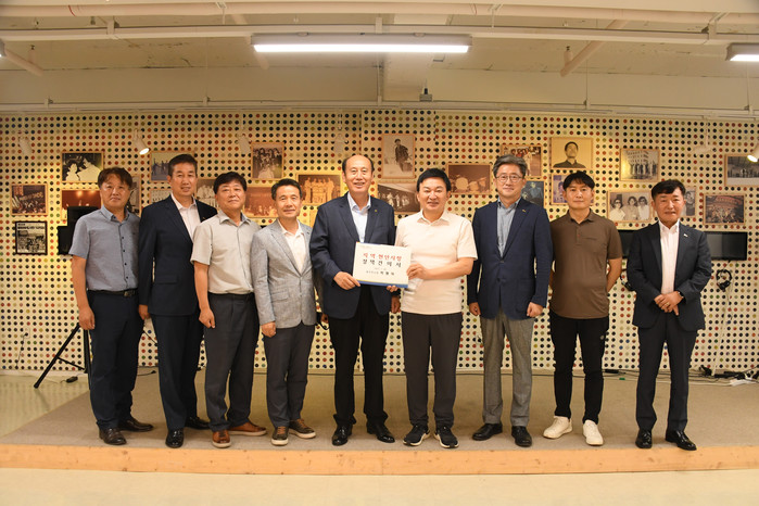 박형덕 경기 동두천시장이 최근 원희룡 국토교통부 장관을 만나 동두천시 주요 현안을 논의하고, 원활한 사업추진을 요청했다. 이날 박 시장은 ▲동두천시 조정대상지역 해제 ▲수도권광역급행철도(GTX-C노선) 동두천 연장 ▲광역교통망과 연계한 남북고속도로 건설(서울-동두천-연천) 등을 건의했다. 사진은 박 시장(왼쪽 다섯 번째)과 원 장관(왼쪽 여섯 번째)이 기념촬영을 하는 모습. (사진제공=동두천시청)