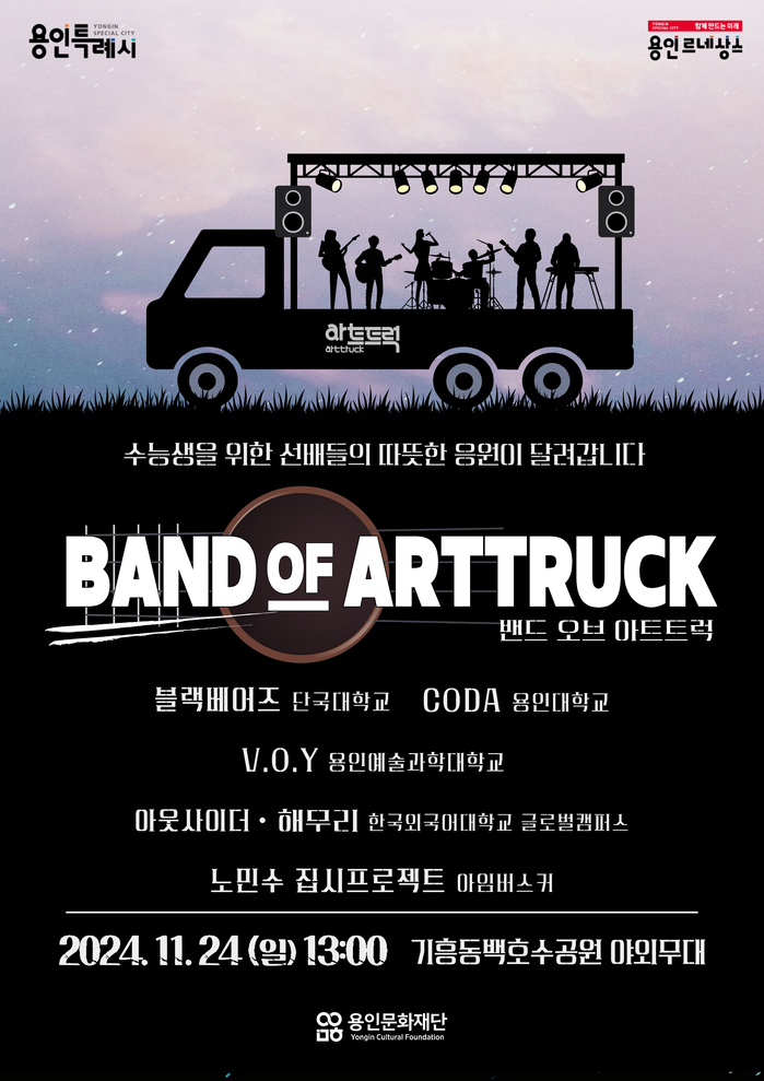 ‘2024 밴드 오브 아트트럭’은 용인문화재단이 운영하고 있는 이동형 무대차량인 ‘아트트럭’의 두 번째 기획 공연으로, 수능을 마친 수험생들을 위한 용인시 관내 대학 선배들의 따뜻한 응원의 무대로 기획되었다.
