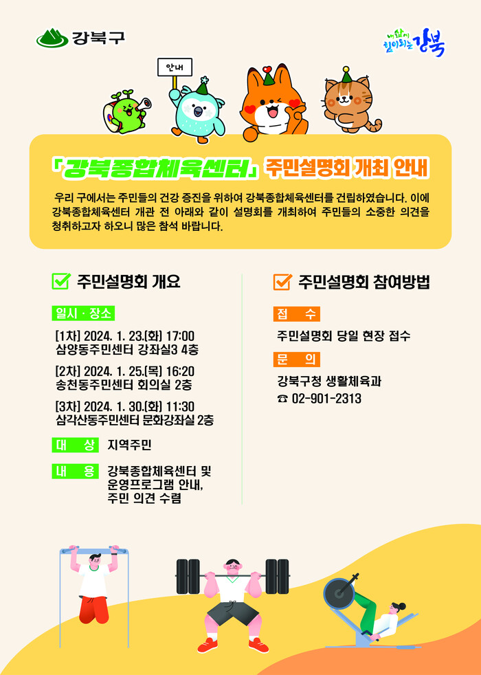 [시민일보 = 홍덕표 기자] 강북구(구청장 이순희)가 강북종합체육센터를 개관 전, 시설 운영에 대한 정보를 공유하고 주민들의 의견을 수렴하기 위해 23일 삼양동 주민센터를 시작으로 '찾아가는 주민설명회'를 3회 개최한다.