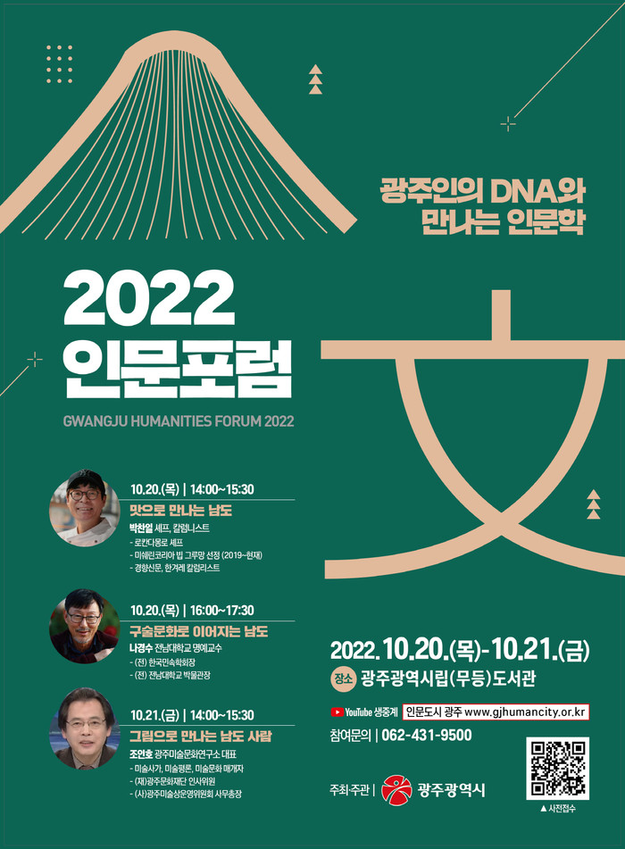 참여 신청은 인문도시광주 홈페이지에서 접수하며, 행사 당일 유튜브 ‘인문도시 광주’ 채널에서 실시간 생중계된다.
