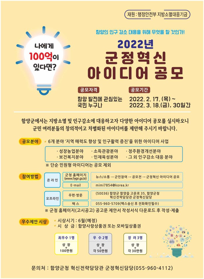 함양군은 2022 군정혁신 아이디어 공모전에 더욱 다양한 아이디어 발굴을 위해 공모기간을 연장하고 참가대상을 확대하기로 하였다.