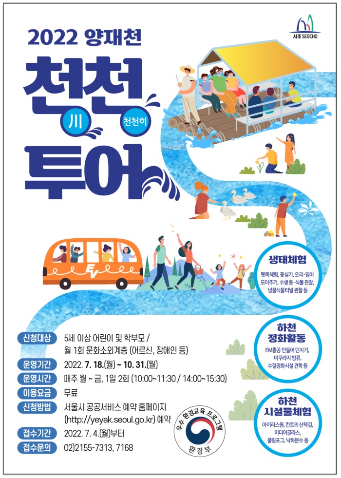 ‘양재천 천천투어’는 ‘하천에서 천천히 즐기는 투어’라는 의미로, 어린이들이 양재천에서 잠시나마 자연을 만끽하고, 하천 보전의 중요성을 느끼도록 구에서 마련한 체험형 환경 프로그램이다.