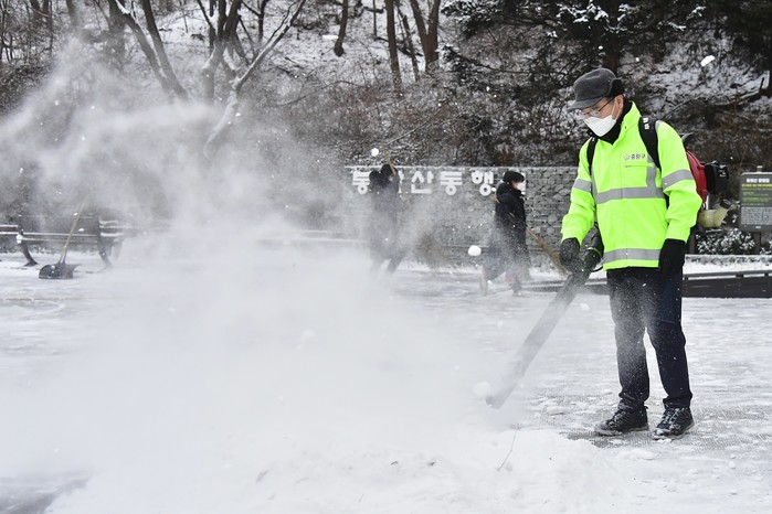 서울 중랑구는 19일 오후 내린 폭설로 인한 주민들의 불편을 최소화하기 위해 전직원들이 제설작업에 나섰다. 사진은 이날 류경기 구청장이 봉화산 동행길에서 제설작업을 하고 있는 모습. (사진제공=중랑구청)