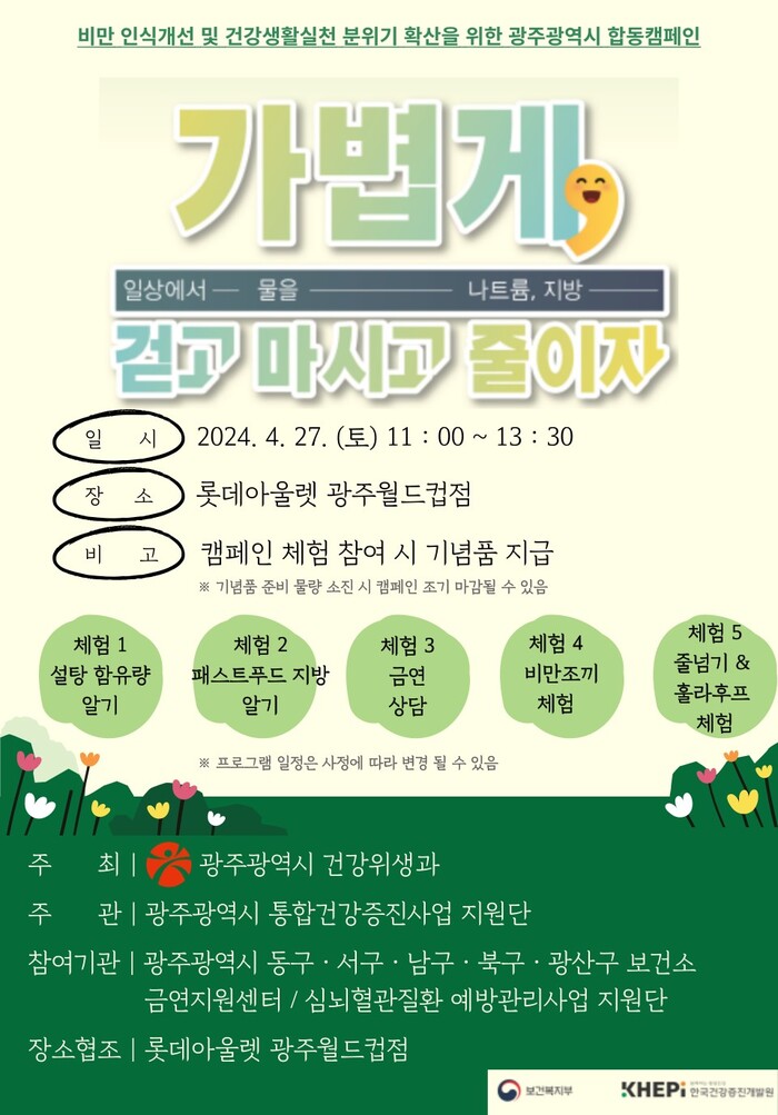 행사에서는 ▲설탕 함유량과 패스트푸드 지방 알기 ▲정상 복부둘레와 내 복부둘레 알기 ▲건강생활실천 퀴즈 이벤트 ▲비만조끼 착용체험 ▲줄넘기 뛰기 ▲금연상담 등 다양한 프로그램이 마련된다.