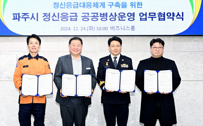 [파주=조영환 기자] 경기 파주시가 최근 파주경찰서, 파주소방서, 연세서울병원과 업무협약을 체결하고 정신과적 응급상황에 대한 대응체계를 구축했다.