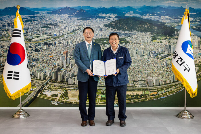 | ▲ 광진구-건국대학교 협약식에서 원종필 건국대 총장(왼쪽), 김경호 광진구청장(오른쪽)이 기념촬영을 하고 있다. (사진=광진구청 제공) |