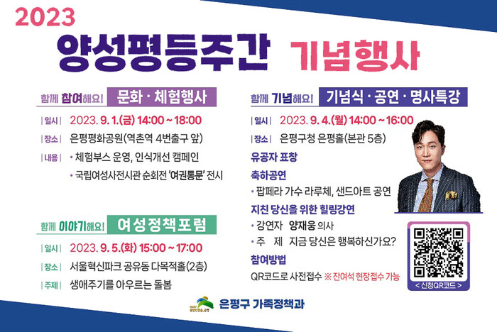 양성평등주간 기념식은 내달 4일 은평구청 은평홀에서 오후 2~4시 개최한다. 양성평등실현 유공자 표창 수여, 팝페라 가수 라루체와 샌드아트 등의 축하공연이 있다. 이어 명사 특강에서는 하트시그널, 장미의 전쟁 등 여러 방송에 출연한 양재웅 정신건강의학과 전문의가 강사로 나서 ‘지금 당신은 행복하신가요?’를 주제로 강연을 진행한다. 기념식은 포스터에 첨부된 큐알(QR)코드를 모바일로 스캔해서 참여할 수 있으며, 잔여석이 있으면 현장 접수도 받는다.