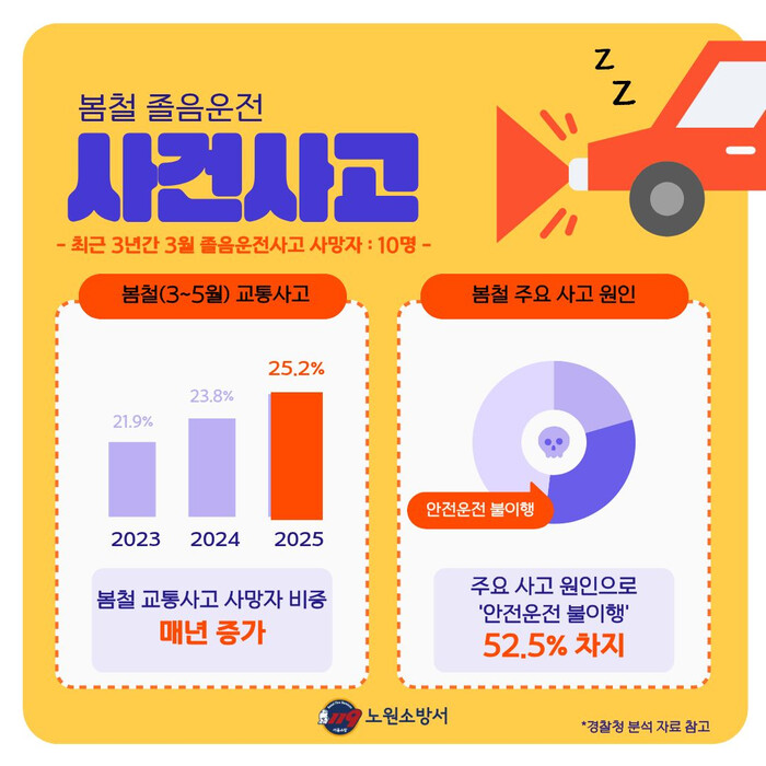 노원소방서가 제작한 카드뉴스에는 봄철 졸음운전의 주요 원인으로 ▲수면 부족에 따른 집중력 저하 ▲장시간 운전에 따른 피로 ▲차량 내 이산화탄소 증가로 인한 두통과 졸음 ▲기온 상승과 강한 햇빛으로 인한 나른함 등이 소개됐다.