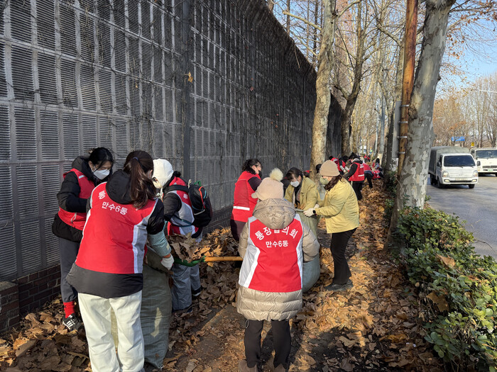 만수6동 통장자율회는 환경정비를 통해 무네미로 일대 낙엽 및 쓰레기를 청소하였으며 주민들의 통행 안전을 확보하고 관내 출입구 미관을 개선했다.