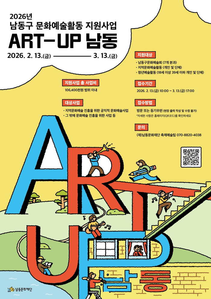 [인천=문찬식 기자] 인천 남동구 남동문화재단은 지역 예술인의 안정적인 창작 활동 지원 및 지속 가능한 문화예술 기반 조성을 위해 2026년 남동구 문화예술활동 지원사업인 ‘ART-UP 남동’ 공모를 진행한다고 밝혔다.