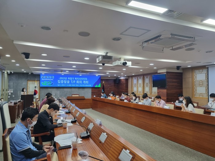 경기 오산시가 지난 11일 2022년 하절기 복지 사각지대 집중발굴 TF 회의를 개최했다. 이날 회의는 희망복지과, 노인장애인과, 경찰서 등 유관기관에서 총 18명이 참석한 가운데 각 분야에서 폭염 기간 복지 위기가구 발굴 지원 방안을 심도 있게 논의했다. 사진은 이날 회의가 진행되고 있는 모습. (사진제공=오산시청)