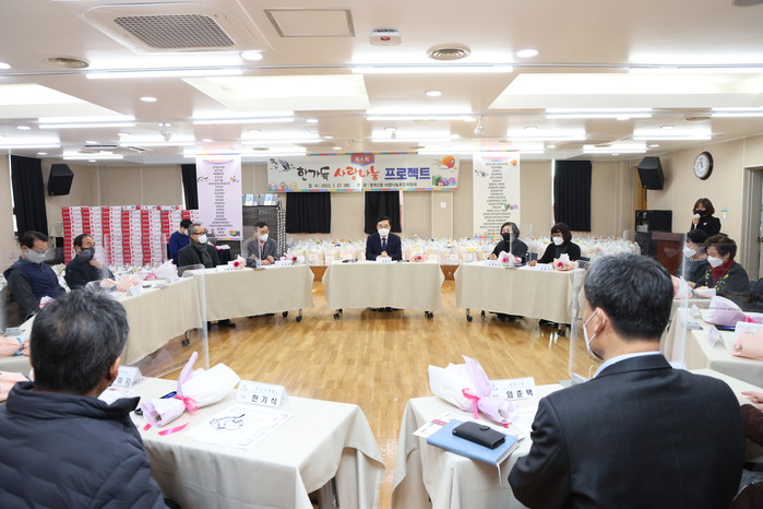 서울 도봉구 방학2동 사랑나눔 추진위원회는 최근 '한가득 사랑나눔 프로젝트 나눔행사'를 개최해 지역내 자영업자·양말공장 등 주민들로부터 햇반·떡국 등 식료품과 양말 등 생필품 총 3000여만원 상당의 성품을 모았다. 물품은 소외 계층 250가구에 전달될 예정이다. 사진은 이동진 구청장(가운데)이 행사에 참석해 대화를 나누고 있는 모습. (사진제공=도봉구청)