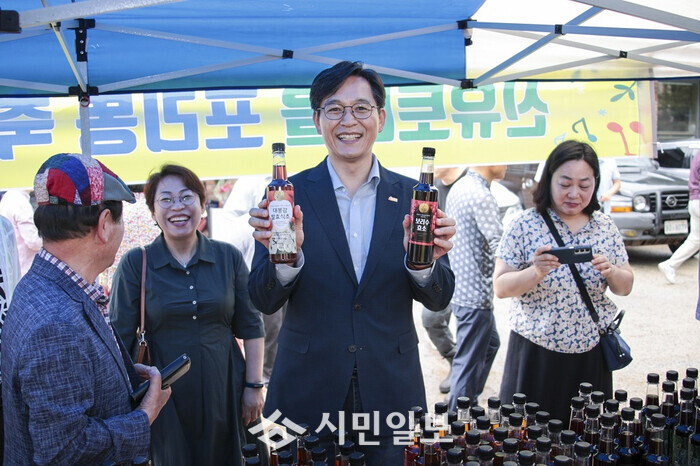 | ▲ 우승희 영암군수가 지난 14일 금정면 신유토마을에서 개최된 포리똥 축제에 참석해 포리똥열매(보리수 열매)를 이용한 효소를 홍보하고 있다. / 영암군 제공 |