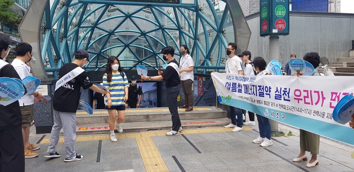 서울 서초구는 여름철을 맞아 에너지시민연대 및 에코허브와 함께 최근 강남대로에서 에너지 절약 캠페인을 실시했다. 캠페인에서는 주민 및 인근 상인에게 여름철 실내 적정온도 26도 준수 등 에너지절약 기본수칙을 알리고, 부채와 홍보물을 나눠주며 탄소중립 실현에 적극적인 동참을 호소했다. 사진은 이날 캠페인이 진행되고 있는 모습. (사진제공=서초구청)