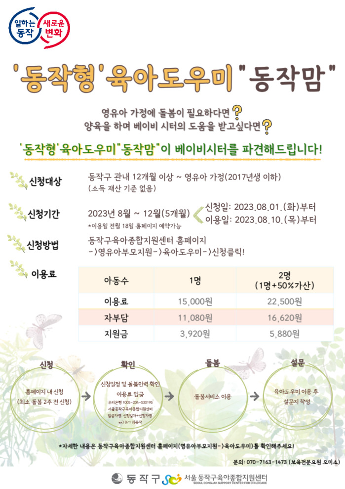 [시민일보 = 여영준 기자] 서울 동작구(구청장 박일하)는 돌봄이 필요한 아동이 있는 가정에 방문해 육아돌봄을 지원하는 ‘동작형 육아도우미’ 사업을 8월부터 시범 추진한다고 밝혔다.