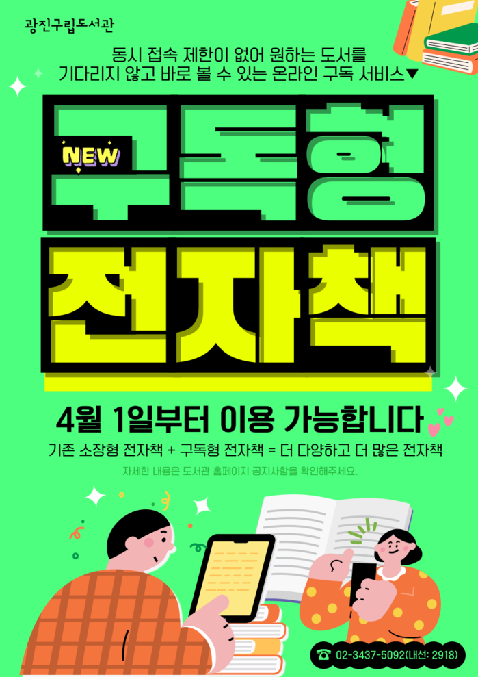 [시민일보 = 여영준 기자] 광진구(구청장 김경호)는 이달부터 ‘구독형 전자책’ 서비스를 개시했다고 14일 밝혔다.
