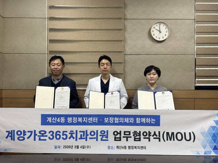 [인천=문찬식 기자] 인천 계양구 계산4동(동장 한경화)은 계산4동보장협의체, 가온365치과와 함께 지난 4일 저소득 취약계층의 치과 진료 지원을 위한 의료지원 업무협약을 체결했다고 밝혔다.