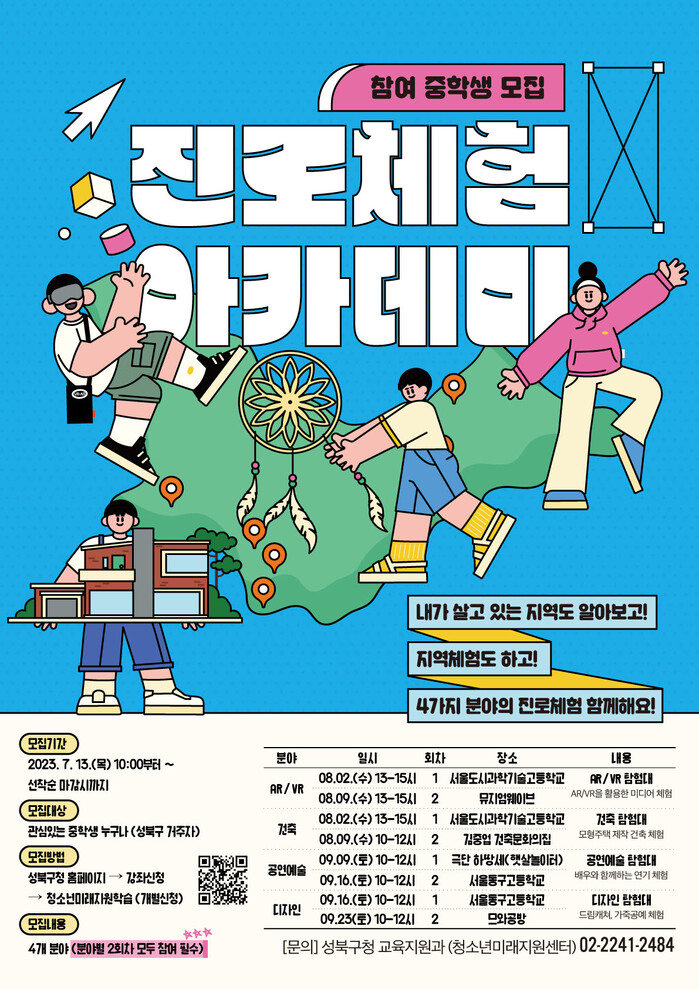 [시민일보 = 홍덕표 기자] 서울 성북구(구청장 이승로)가 오는 8월2일~9월23일 지역내 중학생을 대상으로 4가지 분야(AR/VR, 건축, 공연예술, 디자인) 진로체험 프로그램 ‘진로체험 아카데미’를 운영한다.