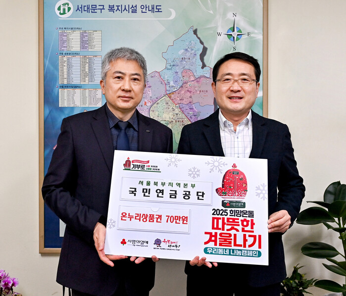 [시민일보 = 이대우 기자] 서대문구(구청장 이성헌)는 최근 국민연금공단 서울북부지역본부(본부장 이승춘)가 ‘2025 희망온돌 따뜻한 겨울나기 성금’으로 70만 원 상당의 온누리상품권을 기탁해 주위를 훈훈하게 했다고 17일 밝혔다.