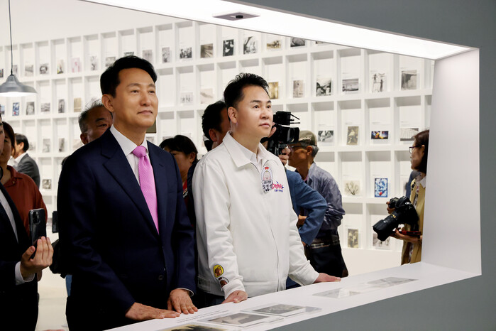 | ▲ 오세훈 서울시장과 오언석 구청장(오른쪽)이 함께 사진 전시를 관람하고 있다. (사진=도봉구청 제공) |