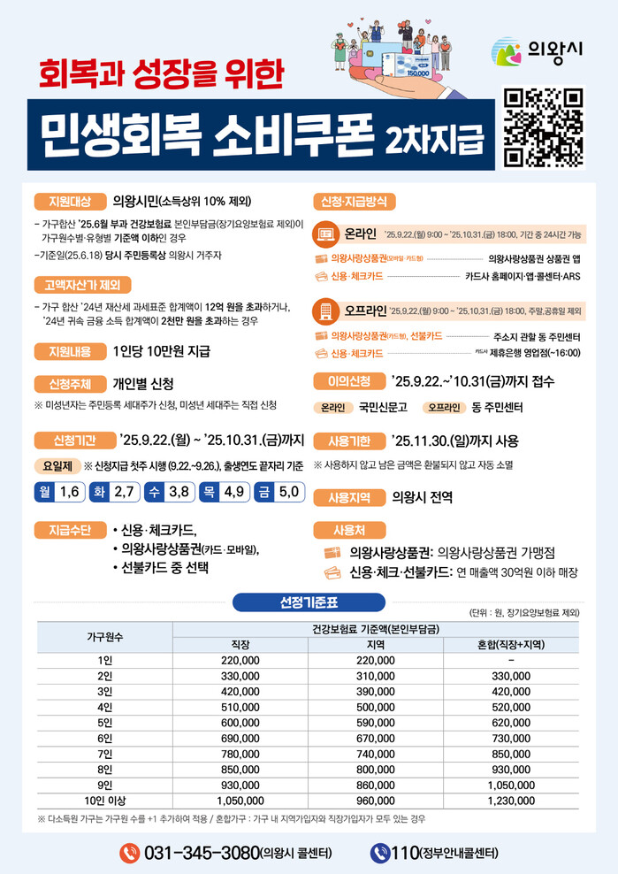 소비쿠폰은 1인당 10만원이 지급되며, 신용·체크카드 충전, 선불카드, 그리고 의왕사랑상품권(모바일·지류) 가운데 원하는 방식으로 받을 수 있다. 지급 받은 쿠폰은 11월30일(일)까지 사용 가능하다.