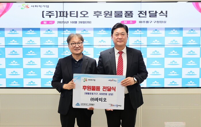 [인천=문찬식 기자] 인천 미추홀구(구청장 이영훈)는 지난 28일 구청장실에서 관내 사회적기업인 ㈜파티오(대표 김태균)로부터 재활 운동기구를 전달받았다.