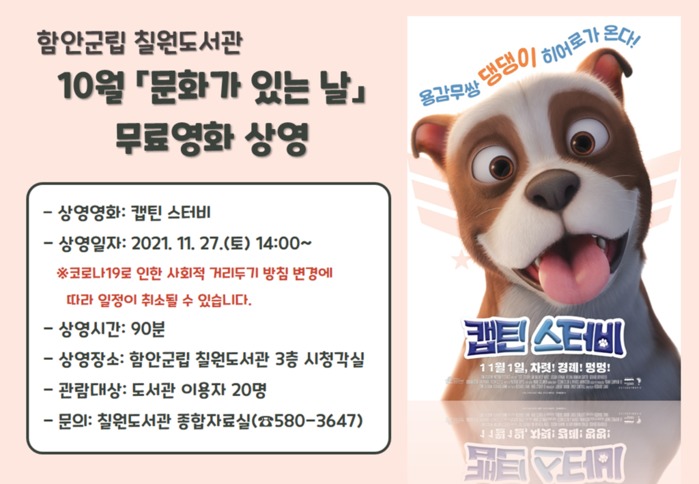11월에 상영 영화는 ‘캡틴 스터비’로 1차 세계대전 당시 활약한 ‘스터비’라는 군견의 실화를 바탕으로 한 애니메이션이다. 똘똘하고 누구보다 용감한 군견 ‘스터비’와 병사 ‘콘로이’의 끈끈한 우정을 그렸다.