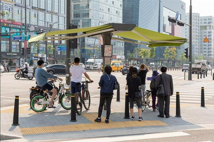| ▲ 마곡역 3번 출구에 위치한 스마트 그늘막. (사진=강서구청 제공) |