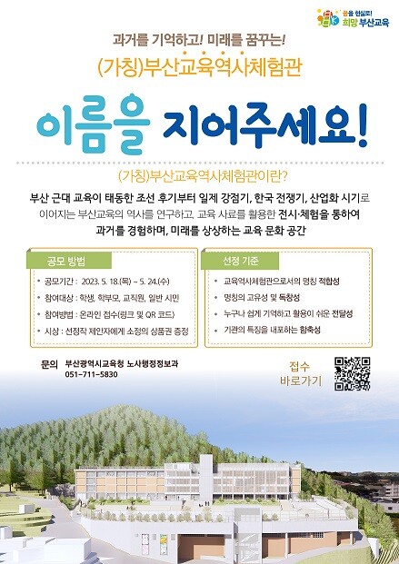허수인 시교육청 노사행정정보과장은 “(가칭)부산교육역사체험관은 부산교육의 가치를 기억하고 체험을 나누는 교육 문화 시설으로 설립한다”며 “체험관의 설립 취지와 역할에 부합하는 명칭이 선정할 수 있도록 많은 분의 관심과 참여를 부탁드린다”고 말했다.