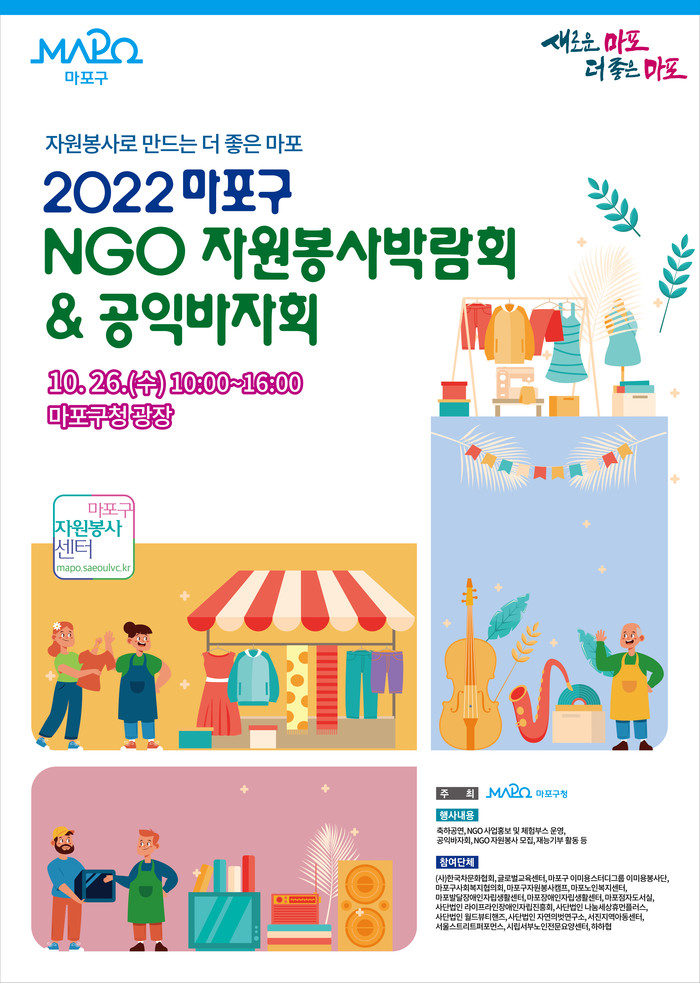 [시민일보 = 박준우 기자] 서울 마포구(구청장 박강수)는 26일 오전 10시부터 6시간 동안 구청 광장에서 '2022 NGO 자원봉사박람회 및 공익바자회'를 개최한다.