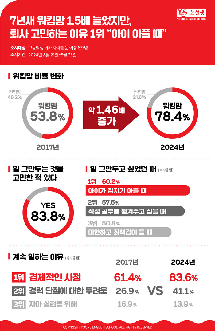 그 결과 현재 일을 하고 있다고 답한 엄마(워킹맘)의 비율이 78.4%를 차지했다. 이는 회사, 자영업(사업), 파트타임 근무를 모두 포함한 수치다. 윤선생이 지난 2017년 고등학생 이하 자녀를 둔 여성 572명을 대상으로 실시한 설문조사에서 워킹맘 비율은 53.8%였다. 7년만에 워킹맘 비율은 24.6%p 늘었고, 이는 약 1.5배 증가한 수치다.