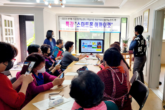 경기 하남시가 9일 학암동 노인을 대상으로 찾아가는 스마트폰 사용 교육을 운영했다. 이날 특강은 스마트폰 기본사용법 등 실생활에 필요한 스마트폰 사용법을 보조강사와 함께 1대1로 실습하는 방식으로 진행됐다. 사진은 스마트폰 사용 교육을 진행하고 있는 모습. (사진제공=하남시청)