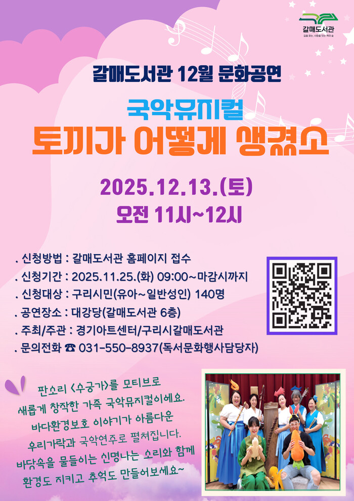 국악뮤지컬 「토끼가 어떻게 생겼소」라는 연말을 맞아 오는 12월 13일(토) 오전 11시, 갈매도서관 6층 대강당에서 경기아트센터와 함께 어린이와 가족을 위해 마련된 공연이다.