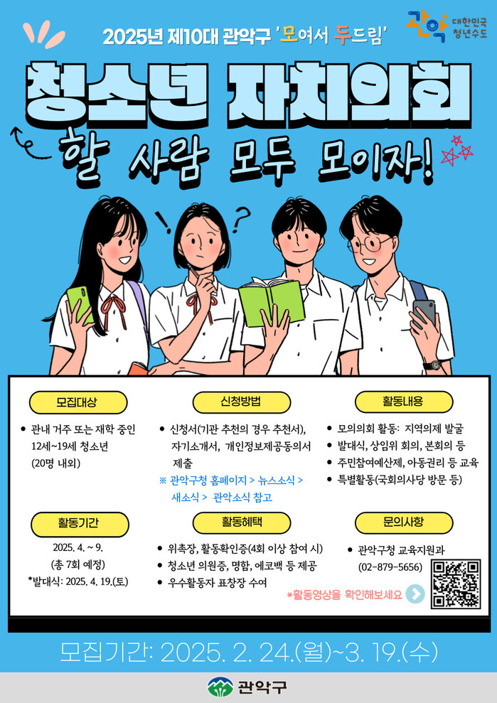 [시민일보 = 문민호 기자] 서울 관악구(구청장 박준희)는 오는 3월19일까지 청소년 자치의회 ’모두(모여서 두드림)‘ 제10대 의원으로 활동할 청소년을 모집한다고 27일 밝혔다.