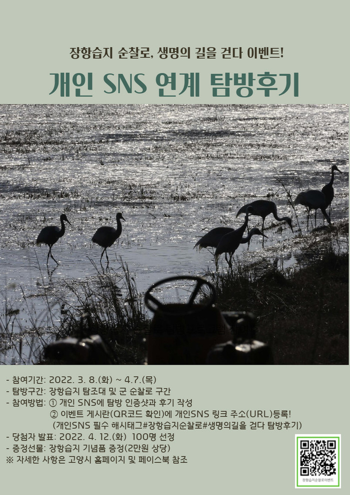 이벤트 신청은 개인 SNS 계정에 여행 사진이나 영상을 첨부하여 후기를 작성하고 해시태그(#장항습지순찰로 #생명의 길을 걷다 탐방후기)를 붙인 후 이벤트란에 SNS주소를 링크하여 등록.신청하면 된다.