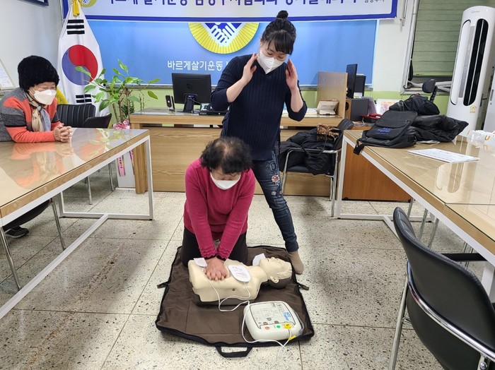 바르게살기운동 경기 남양주시협의회 여성위원회가 지난 27일 심폐 소생술 교육을 했다. 이날 교육에서는 심뇌혈관 응급 상황 대처를 위한 심폐 소생술 기본 지식과 자동 심장 충격기 사용법을 배웠다. 사진은 이날 회원들이 심폐 소생술 교육을 받고 있는 모습. (사진제공=남양주시청)