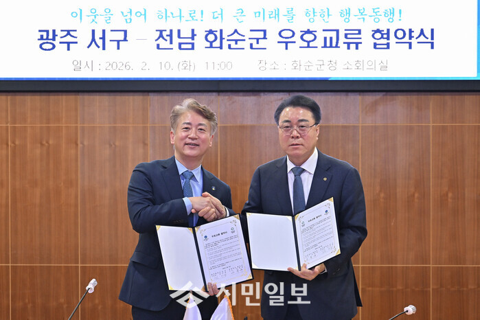 [광주=정찬남 기자] 광주광역시 서구(구청장 김이강)는 10일 전라남도 화순군청에서 화순군과 우호교류 협약을 체결하고 생활권을 공유하는 이웃 지자체 간 협력과 공동발전을 위한 상생 체계를 구축하기로 했다.