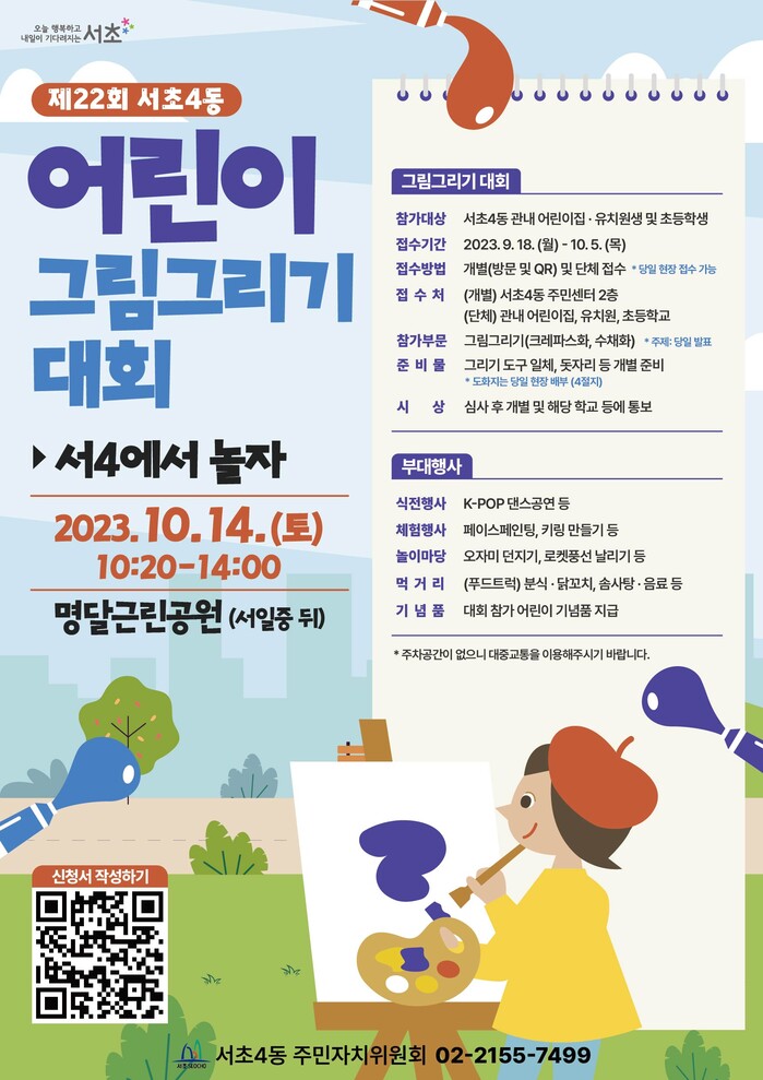 올해 22년째 맞이하는 ‘제22회 서초4동 어린이 그림그리기 대회’는 어린이들의 숨은 끼와 재능을 펼칠 수 있는 기회를 제공하고, 가족, 친구, 이웃들과 서로 어울리며 함께 즐기고자 ‘서4에서 놀자’는 주제로 기획됐다.