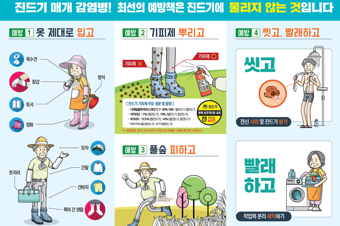 농작업 등 야외활동 중에는 △풀 위에 앉을 때 작업용 방석이나 돗자리를 사용하도록 하고, △보조적으로 진드기 기피제를 약 4시간마다 의복 등에 적당량 뿌려주면 진드기 물림 예방에 도움이 된다. 농작업 등 야외활동 후에는 △몸을 씻고 △작업복은 충분히 털어내고 세탁해야 한다.