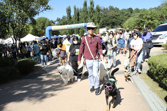 | ▲ ‘제5회 강동 동물사랑축제’의 숲길 걷기 대회 참가자들이 반려견과 함께 걷고 있다. (사진제공=강동구청) |