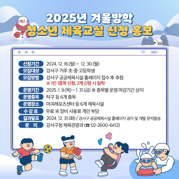 [시민일보 = 박소진 기자] 강서구(구청장 진교훈)가 겨울방학을 맞아 ‘2025년 겨울방학 청소년 체육교실’ 참가자를 오는 16일부터 30일까지 모집한다고 밝혔다.