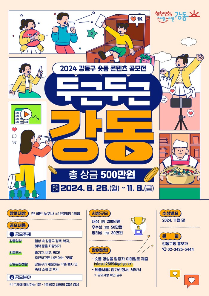 전 국민 누구나 개인 또는 팀으로 참여가 가능하며, 신청은 구청 홈페이지→고시·공고→‘2024 강동구 숏폼 콘텐츠 공모전 개최’ 게시글에서 제출서류를 확인하고, 제작한 영상 원본을 서류와 함께 담당자 이메일(siosul2669@gd.go.kr)로 제출하면 된다.