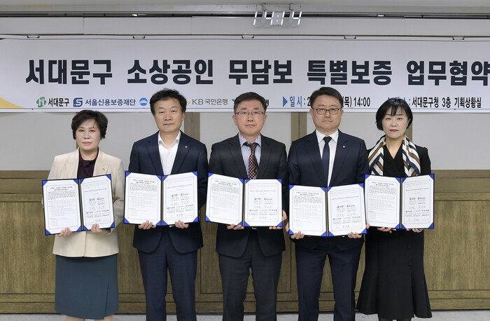 | ▲ 소상공인 무담보 특별보증 업무협약식에서 진경식 부구청장(가운데)이 국민은행, 우리은행, 하나은행, 서울신용보증재단 관계자들과 협약 체결 후 협약서를 들고 기념촬영을 하고 있다. (사진=서대문구청 제공) |