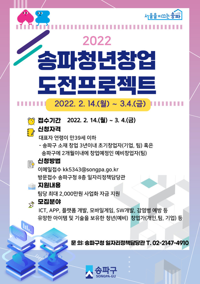 [시민일보 = 이대우 기자] 송파구(구청장 박성수)가 오는 3월4일까지 ‘2022 송파 청년창업도전프로젝트’에 참여할 (예비)청년창업기업을 모집한다.