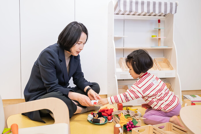 | ▲ 강동구의 첫 서울형 키즈카페에 방문한 이수희 구청장이 한 유아와 시간을 보내고 있다. (사진=강동구청 제공) |