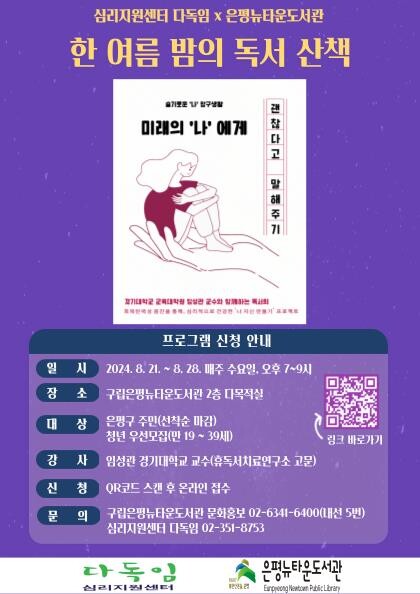 [시민일보 = 이대우 기자] 서울 은평구(구청장 김미경)는 구민을 위한 특별한 독서심리 프로그램 ‘한 여름 밤의 독서 산책’의 마지막 회차를 진행한다고 밝혔다.