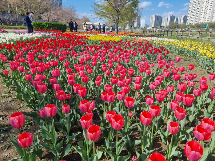 22일 구에 따르면 올해 봄에는 약 8만본의 튤립을 심어 붉은색, 노란색, 보라색 등 형형색색의 꽃들이 어우러져 장관을 이루고 있다.