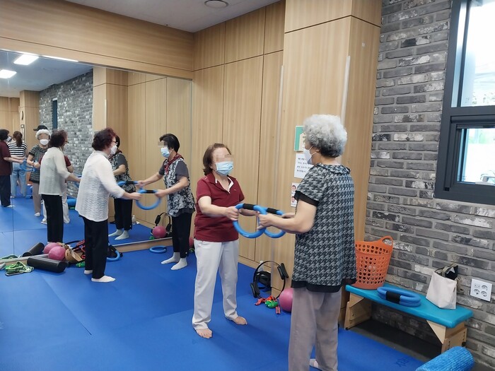 | ▲ 스모비를 이용해 재활운동하는 노인들. (사진=노원구청 제공) |