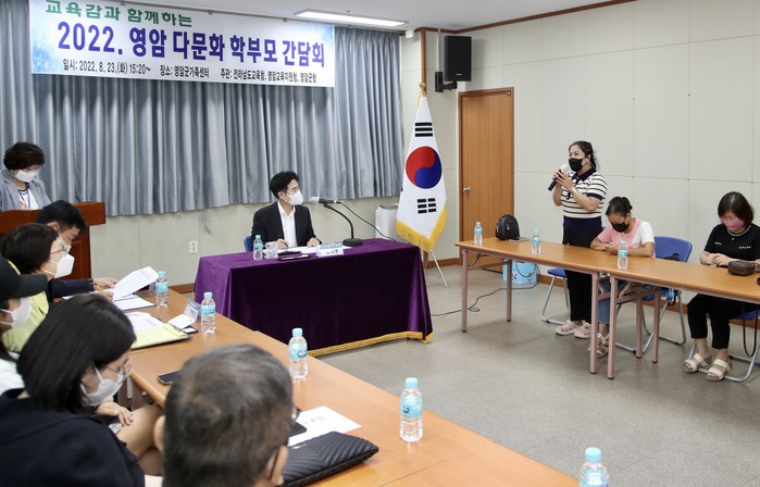 전라남도교육청이 지난 23일 ‘교육감과 함께하는 영암 다문화 학부모 간담회’를 운영해 다문화학생 교육과 지원 등에 대한 의견을 나눴다. 사진은 간담회에서 김대중 교육감(가운데)이 다문화가정 학부모의 의견을 듣고 있는 모습. (사진제공=전라남도교육청)